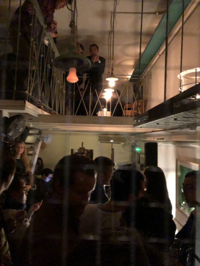 10畳くらいのスペースに40人くらいのお客さんがごった返しています。